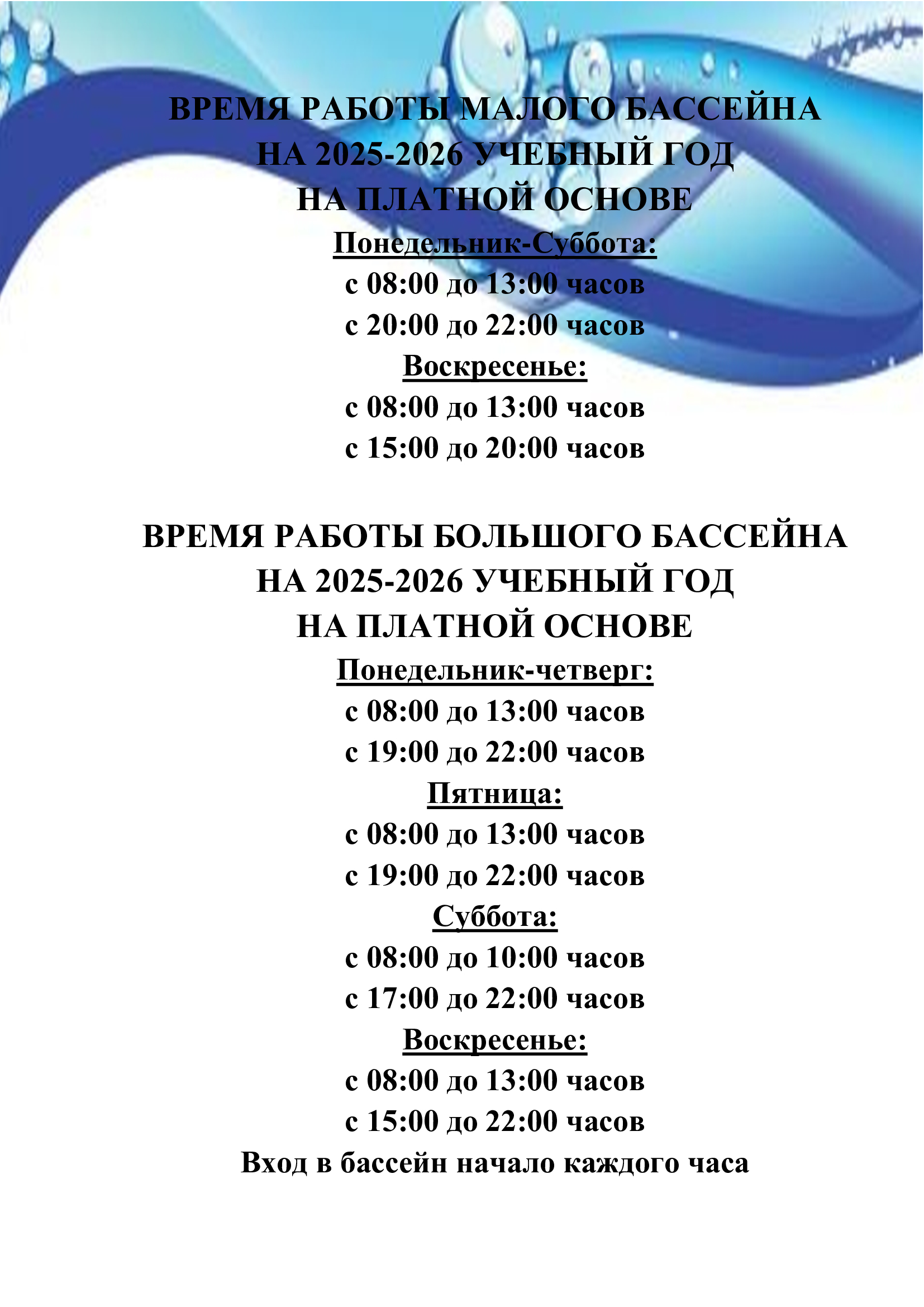 ГРАФИК РАБОТЫ БАССЕЙНА НА ПЛАТНОЙ ОСНОВЕ