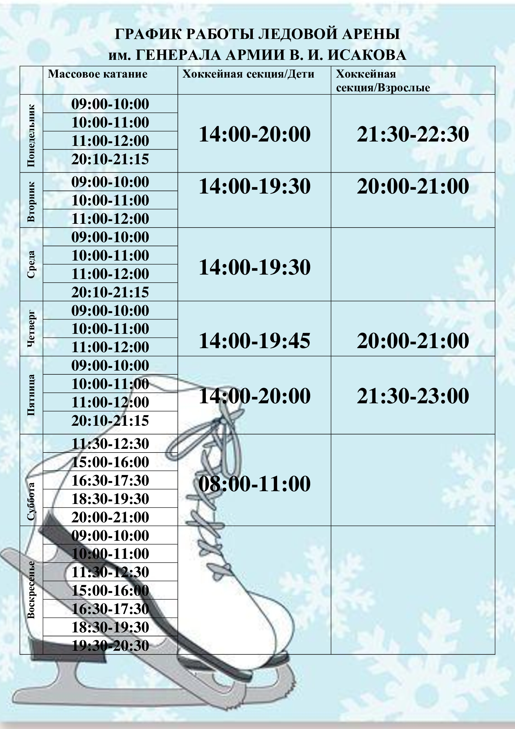 РАСПИСАНИЕ РАБОТЫ ЛЕДОВОЙ АРЕНЫ им. ГЕНЕРАЛА АРМИИ В.И. ИСАКОВА НА ОСЕННИХ КАНИКУЛАХ